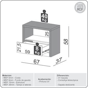 Estrutura em 100% MDF 15mm, tampo e laterais 38mm.