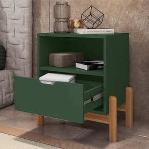 AMesa de cabeceiracom pés de madeira maciça,tornando-o ainda mais resistente. Acabamento de pintura UV. ( Semi-Fosco ) Frente de gaveta usinada.