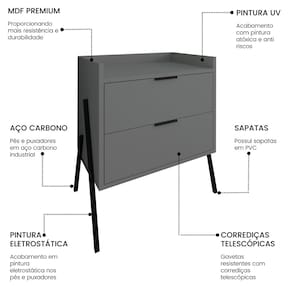 Informações adicionais: - Produto fabricado em MDF Premium; - Peso máximo suportado: 8kg; - Pés e puxadores em Aço Carbono industrial; - Acabamento pintura UV atóxica anti riscos; - Com pintura eletrostática; - Sapatas em PVC; - Gavetas com Corrediças Telescópicas; - Necessita montagem.