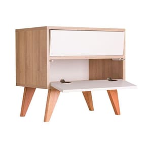 Mesa de Cabeceira Retrô Modelo Bréscia na cor Carvalho Treviso (Madeira Clara) e portas Branco traz organização com estilo para o seu quarto. Possui lindos pés torneados em diagonal.