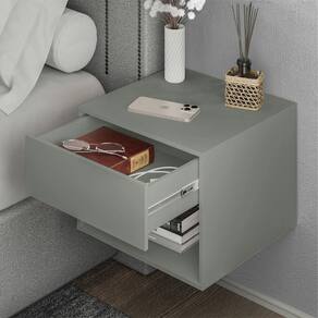 Mesa De Cabeceira Suspensa Carisma MDP Cinza Com Gaveta A Mesa de Cabeceira Suspensa Cinza da marca Carisma é um móvel desenvolvido para instalação em parede, oferecendo praticidade e organização em ambientes internos. Fabricada em MDP, apresenta acabamento fosco e estilo moderno, adequado para compor quartos com design funcional e discreto. O produto possui uma gaveta equipada com corrediça telescópica, que permite abertura suave e completa, além de um nicho aberto que auxilia na disposição de objetos de uso diário.