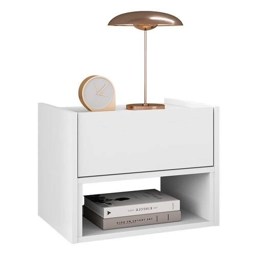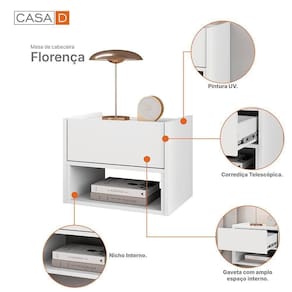 Mesa De Cabeceira Suspensa Florença 1 Gaveta Branco - Casa D Branco Mesa de Cabeceira Suspensa Florença 1 Gaveta - Casa D Com design compacto, moderno e funcional, a Mesa de Cabeceira Suspensa Florença é perfeita para otimizar o espaço do seu quarto. Produzida em MDF e MDP com pintura UV, traz elegância e praticidade ao ambiente. Possui 1 gaveta com corrediças telescópicas que garantem abertura suave e durabilidade, além de nicho interno ideal para organizar objetos do dia a dia. Por ser suspensa, facilita a limpeza e proporciona um visual mais leve e contemporâneo ao ambiente. ESPECIFICAÇÕES: - Estrutura em MDF e MDP - Pintura UV - 1 Gaveta - Corrediças telescópicas - Nicho interno - Suspensa