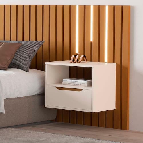 Mesa de cabeceira suspensa: design elegante que otimiza o espaço do quarto.