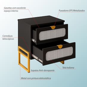 Tipo: Mesa de Cabeceira Modelo: Titanium Cor: Preto Cor da Base: Dourado Estrutura: MDP com acabamento em pintura UV Pés: Metal com pintura eletrostática Possui 2 gavetas: Corrediças metálicas Frentes decorativas em padrão rattan Puxadores embutidos Design: Moderno, funcional e elegante Garantia: 3 meses contra defeitos de fabricação