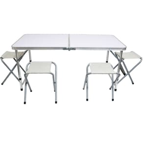 Uma mesa super prática e fácil de montar e desmontar em qualquer lugar, sendo facilmente transportada no Carro ou até mesmo a pé. Mesa em cor Branco e Cinza mesclado na tampa e estrutura em Alumínio, com duas alturas podendo ser usada em vários ambientes ou ocasiões conforme a necessidade para o uso, super versátil e prática, resistente e alta durabilidade, sendo um ótimo investimento de custo-benefício. E ainda acompanha 4 bancos que podem ser guardados dentro da mesa para o transporte.