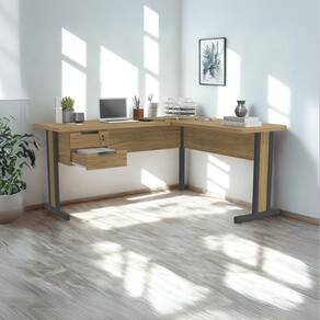 Mesa para Escritório em L com Gaveteiro, solução funcional com design inteligente para escritórios modernos e ambientes corporativos. Estrutura em MDP (mesa 30 mm/ gaveteiro 15 mm) com acabamento pintura BP, pés metálicos com pintura epóxi (fosco) e sapatas niveladoras. Equipada com 2 gavetas (sendo uma delas com trava por chave), corrediças telescópicas, puxadores em polipropileno e montagem flex (lado direito ou esquerdo), exclusivo para fixação em mesas da linha Versátil. Este produto será entregue em 03 volumes.