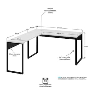 - A saia possui 20cm de altura garantindo ótima estabilidade a mesa Produto Montado: Sim Acompanha Manual de Instalação: Sim Ambiente Principal: Escritório codigo_ean: 7906479668709 Complexidade da Montagem: Baixa: pode ser montado por uma pessoa sozinha Cor: Branco Cor do Produto: Branco Cor Interna: Branco Dobrável: Não Escala de Brilho: Semi-Brilho Espessura do Tampo: 30 mm Formato: Em L Itens Inclusos: 1 Escrivaninha, Manual de Montagem e Kit Ferragens Linha ou Coleção: Office Manual de Montagem e Instalação: https://product-hub-prd.madeiramadeira.com.br/866742/documents/d2df5948-2f5d-4a77-a943-9d61e6425356366mesaangularpEretangular.pdf Material da Estrutura: Aço Material do Tampo: MDP Material dos Pés: Aço Material Principal: MDP Montagem Flex: Não Necessita Montagem: Sim Origem do Produto: Nacional Pés com Regulagem de Altura: Não Pés Reguláveis: Não Peso: 31 kg Possui Painel: Não Possui Passa Cabos: Não Possui Porta Objetos: Não Possui Portas: Não Possui Prateleiras: Não Possui suporte para CPU: Não Possui Suporte para Teclado: Não Possui Vidro: Não Recomendações de Uso, Manutenção e Limpeza: Limpeza com pano úmido, sem produtos químicos Sapatas Niveladoras: Sim Sistema de Montagem: Parafusos, cavilha e minifix Suporta Até (kg): 85 kg Ean: 7906479668709