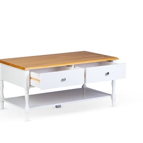 A mesa de centro combina elegância clássica e funcionalidade para complementar sua sala de estar com charme e praticidade. Com tampo em madeira maciça, que traz um toque acolhedor e sofisticado, e estrutura em acabamento branco, o design destaca-se pelos pés torneados, que remetem ao estilo tradicional com leveza e delicadeza. Possui duas gavetas espaçosas, além de uma prateleira inferior que amplia o espaço de organização. É ideal para compor ambientes aconchegantes e elegantes. Uma peça versátil, que harmoniza facilmente com diferentes estilos de decoração.