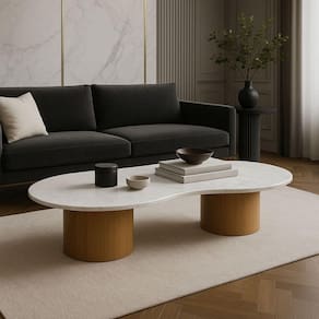 A Mesa de Centro Aura reflete a essência da harmonia entre leveza, fluidez e sofisticação design orgânico foi pensado para valorizar os contrastes entre o Mármore, de veios sutis e refinados, e a base dupla cilíndrica em Freijó, que traz calor e naturalidade ao ambiente.