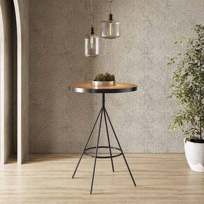 A estrutura em aço com acabamento resistente sustenta com firmeza o tampo de madeira revestido, criando um contraste moderno que conversa bem com qualquer ambiente — da varanda ao cantinho do café. Com altura ideal para uso com banquetas, ela traz ainda um apoio circular para os pés, garantindo conforto extra em cada uso.