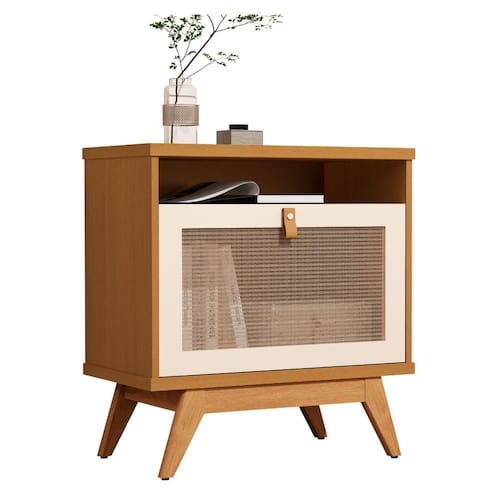 A estrutura é feita em MDP 15/25mm. Possui 1 porta em ratam com moldura de 15mm em MDF, 1 nicho e 4 pés em madeira maciça.