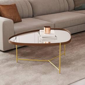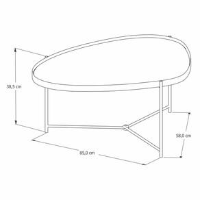 A mesa de centro orgânica alamanda contém a borda em couro sintético com 0,4 cm de altura, espelho e pés em ferro na cor dourado.