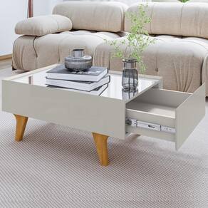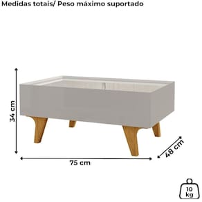 Mesa de Centro Sena, ideal para compor salas com funcionalidade. Estruturada em MDP com acabamento em pintura UV texturizada. Conta com gaveta lateral, corrediças telescópicas, tampo em espelho e bordas chanfradas, além de pés em madeira maciça (Pinus). Este produto será entregue em 1 volume.