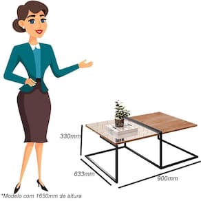 Características Gerais do Produto: - Altura: 33 cm - Ideal para: Sala - Largura: 90 cm - Material: Tampo em BP de 15 mm / Estrutura em metal antioxidantes. - Profundidade: 63 cm - Acabamento: Pintura eletroestática - Informações Adicionais: - Não acompanha itens de decoração; - Mesa de Centro vai em caixa desmontada; - Não nos responsabilizamos pela montagem dos produtos. Todos os produtos acompanham acessórios para que sejam montados. - Não nos responsabilizamos, no ato da entrega, por subir escadas/elevadores ou transporte por guincho em apartamentos. Eventuais despesas são de responsabilidade do comprador; - Confira as dimensões deste produto e certifique-se de que passará normalmente por supostos elevadores, portas, escadas e/ou corredores de sua residência; - Não aceitamos devolução de produtos com caixas violadas ou materiais danificados, confira a quantidade de volumes e se o que está sendo entregue corresponde com a mercadoria adquirida, não aceitamos devolução após o prazo de arrependimento de 7 dias corridos.