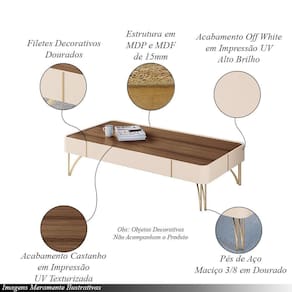 Pés: Em Aço Maciço 3/8 em Tom Dourado Peso Suportado: 5kg distribuídos Conteúdo da Embalagem: 1 Mesa de Centro Necessita de Montagem: Sim, recomendamos que seja feita por um Instruções/Cuidado: Utilizar um pano levemente umedecido com água, seguido de pano seco. Evitar exposição ao sol, para que o produto não sofra alterações nas cores. Não limpar com escovas ou produtos abrasivos. Observações importantes: