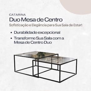 A Mesa De Centro Duo Catarina combina modernidade e praticidade em um design industrial atemporal. Com estrutura em aço carbono e tampo de vidro temperado, oferece resistência e leveza visual, sendo ideal para compor a decoração de salas de estar modernas. O conjunto de duas mesas de alturas diferentes permite o uso de forma combinada ou separada, trazendo versatilidade e funcionalidade ao ambiente. Compacta, elegante e funcional, é perfeita para apoiar objetos decorativos, bandejas ou itens de uso diário, complementando a decoração com estilo.