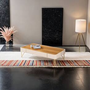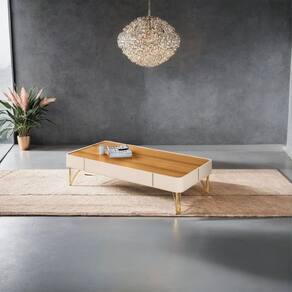 Os pés em aço maciço com acabamento dourado adicionam um toque refinado e garantem resistência e durabilidade. Com estrutura robusta e um visual atemporal, esta mesa de centro é perfeita para compor salas modernas e acolhedoras.