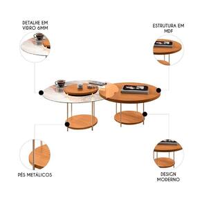 Com um design contemporâneo, as mesas apresentam tampo de MDF de 25mm e em uma das versões bordas em vidro de 6mm, criando uma composição harmoniosa entre diferentes materiais. Os pés em aço maciço 3/8, com acabamento dourado, adicionam um toque de elegância, enquanto a leveza das formas e a versatilidade da Mesa de Centro redonda permite diversas possibilidades de decoração. Ambas possuem uma prateleira inferior, um espaço extra para revistar e objetos decorativos. Ao serem usadas em conjunto, elas oferecem uma solução prática e estilosa para compor ambientes modernos e sofisticados.
