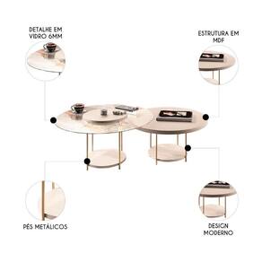 Com um design contemporâneo, as mesas apresentam tampo de MDF de 25mm e em uma das versões bordas em vidro de 6mm, criando uma composição harmoniosa entre diferentes materiais. Os pés em aço maciço 3/8, com acabamento dourado, adicionam um toque de elegância, enquanto a leveza das formas e a versatilidade da Mesa de Centro redonda permite diversas possibilidades de decoração. Ambas possuem uma prateleira inferior, um espaço extra para revistar e objetos decorativos. Ao serem usadas em conjunto, elas oferecem uma solução prática e estilosa para compor ambientes modernos e sofisticados.