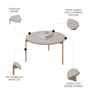 Características do Produto Material da Estrutura: MDF. Espessura das Chapas: 15mm. Peso Suportado: 4 Kg Distribuídos. Acabamento: Pintura UV. Escala de Brilho: Brilho. Possui Gavetas: Não. Possui Prateleiras: Não. Possui Nicho: Não. Possui Pés: Sim. Tipo de Pés: Metal. Diferenciais: - Design moderno. - Tampo usinado com formato circular. - Pés metálicos cilíndricos. - Borda com pintura PU na cor dourada. Sistema de Montagem: Cavilhas/Parafusos/Minifix. Manual de Montagem: Sim. Complexidade da Montagem: Média. Volumes: 2 Volumes. Conteúdo da Embalagem: 1 Mesa de Centro. Garantia do Fabricante: 90 dias contra defeito de fabricação. Montagem: Recomendamos que seja feita por um profissional. Recomendação de Limpeza: Utilize pano úmido.