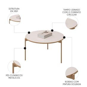 Características do Produto Material da Estrutura: MDF. Espessura das Chapas: 15mm. Peso Suportado: 4 Kg Distribuídos. Acabamento: Pintura UV. Escala de Brilho: Brilho. Possui Gavetas: Não. Possui Prateleiras: Não. Possui Nicho: Não. Possui Pés: Sim. Tipo de Pés: Metal. Diferenciais: - Design moderno. - Tampo usinado com formato Circular. - Pés metálicos cilíndricos. - Borda com pintura PU na cor dourada. Sistema de Montagem: Cavilhas/Parafusos/Minifix. Manual de Montagem: Sim. Complexidade da Montagem: Média. Volumes: 2 Volumes. Conteúdo da Embalagem: 1 Mesa de Centro. Garantia do Fabricante: 90 dias contra defeito de fabricação. Montagem: Recomendamos que seja feita por um profissional. Recomendação de Limpeza: Utilize pano úmido.