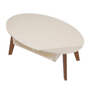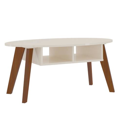 Feito em MDF/MDP 15mm. Possui 2 nichos para objetos e tampo oval de MDF.