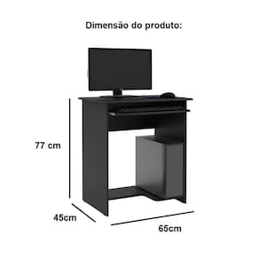 A Mesa de computador Pratica, se adequam a qualquer ambiente , ela possui prateleira móvel para teclado e prateleira fixa que serve como suporte de CPU e materiais em geral. Dimensões do produto montado: Altura: 77,5 cm Largura: 65 cm Profundidade:45 cm Características do produto: Produzido em MDP Pintura em UV Texturização nas cores madeiradas Kit de montagem incluso tampo para teclado recolhivel pés de plastico anti-umidade bordas ergonomicas Cor: Preto Atenção! Confira as dimensões deste produto e certifique-se de que passará normalmente por supostos elevadores, portas, escadas e/ou corredores de sua moradia; As imagens são ilustrativas, eletrodomésticos e demais objetos que compõem o cenário, não fazem parte do anúncio; Sobre a tonalidade das cores, poderá ocorrer alterações conforme a configuração do seu monitor. Orientamos que a montagem e instalações do produto seja realizado por um técnico de sua confiança, após a sua entrega. Não nos responsabilizamos pela instalação/montagem. Fornecemos somente assistências, por defeitos de fábrica. Oferecemos retirada em nossa loja Saimys Móveis na Av. Ragueb Chohfi, °3411 (08341-420) para não haver custo de envio.