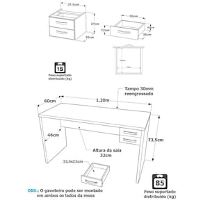 - Dificuldade da Montagem: Fácil Produto Montado: Sim Acompanha Manual de Instalação: Sim Ambiente Principal: Escritório codigo_ean: 7909903402368 Complexidade da Montagem: Baixa: pode ser montado por uma pessoa sozinha Cor: Preto Cor do Produto: Preto Cor Interna: Preto Dobrável: Não Escala de Brilho: Semi-Brilho Espessura do Tampo: 30 mm Formato: Retangular Gaveta com Chave: Não Itens Inclusos: 1 Escrivaninha, Kit Ferragens e Manual de Montagem Linha ou Coleção: Office Manual de Montagem e Instalação: https://product-hub-prd.madeiramadeira.com.br/866994/documents/8cb55c35-5d43-4dff-a7d9-421a16ae7539esareta15mmpemetal1200x600.pdf Material da Estrutura: MDP Material do Puxador da Gaveta: Plástico Material do Tampo: MDP Material dos Pés: MDP Material Principal: MDP Montagem Flex: Não Necessita Montagem: Sim Origem do Produto: Nacional Peso: 28 kg Peso Máximo por Gaveta: 15 kg Possui Painel: Não Possui Passa Cabos: Não Possui Porta Objetos: Não Possui Portas: Não Possui Prateleiras: Não Possui suporte para CPU: Não Possui Suporte para Teclado: Não Possui Vidro: Não Quantidade de Gavetas: 02 Gavetas Recomendações de Uso, Manutenção e Limpeza: Limpeza com pano úmido, sem produtos químicos Sapatas Niveladoras: Sim Sistema de Montagem: Parafusos, cavilha e minifix Suporta Até (kg): 85 kg Tipo de Corrediça da Gaveta: Metálica Simples Ean: 7909903402368