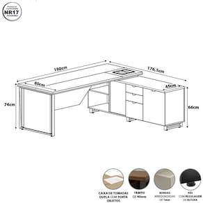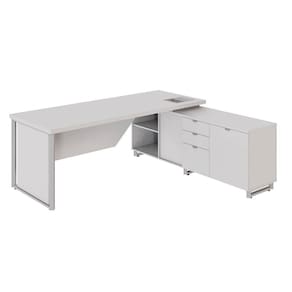 Mesa de Escritório Diretor em L 180cm com Armário Lateral e Caixa de Tomadas Corporate Cinza