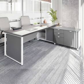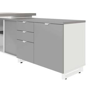 Mesa de Escritório Diretor em L 2,00 com Caixa de Tomadas e Armário Lateral Corporate Cinza Sagrado/Branco