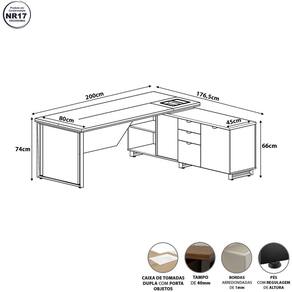 Produto dentro das normas para escritório, pois possui as bordas com os cantos arredondados (NR 17)