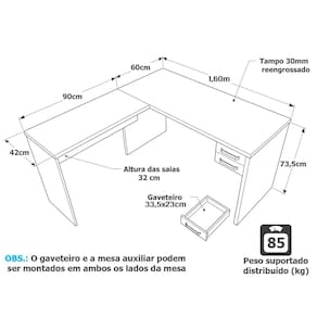 - Pés: 15mm de espessura Produto Montado: Sim Acompanha Manual de Instalação: Sim Ambiente Principal: Escritório codigo_ean: 7909903403976 Complexidade da Montagem: Baixa: pode ser montado por uma pessoa sozinha Cor: Branco Cor do Produto: Branco Cor Interna: Branco Dobrável: Não Escala de Brilho: Semi-Brilho Espessura do Tampo: 30 mm Formato: Em L Gaveta com Chave: Não Itens Inclusos: 1 Escrivaninha, Kit Ferragens e Manual de Montagem Linha ou Coleção: Office Manual de Montagem e Instalação: https://product-hub-prd.madeiramadeira.com.br/867069/documents/fef1ccc9-cdf5-4ce9-8008-6b44f7ff366066mesareta30mmpepainel15mm.pdf Material da Estrutura: MDP Material do Puxador da Gaveta: Plástico Material do Tampo: MDP Material dos Pés: ABS Material Principal: MDP Montagem Flex: Não Necessita Montagem: Sim Origem do Produto: Nacional Peso: 43 kg Peso Máximo por Gaveta: 15 kg Possui Painel: Não Possui Passa Cabos: Não Possui Porta Objetos: Não Possui Portas: Não Possui Prateleiras: Não Possui suporte para CPU: Não Possui Suporte para Teclado: Não Possui Vidro: Não Quantidade de Gavetas: 02 Gavetas Recomendações de Uso, Manutenção e Limpeza: Limpeza com pano úmido, sem produtos químicos Sapatas Niveladoras: Sim Sistema de Montagem: Parafusos, cavilha e minifix Suporta Até (kg): 85 kg