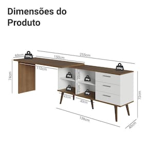 Reta: 74 cm de altura x 255 cm de largura x 60 cm de profundidade total.