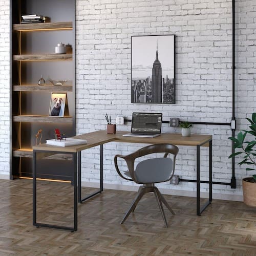 A Linha Kuadra tem seu design com inspiração no estilo industrial, que remete muito a decoração usada nos Lofts das grandes metrópoles nos anos 60 e 70. Harmonizando o metal e os tons de madeira, foram projetados móveis versáteis e com estilo, que podem compor ambientes flexíveis cheios de personalidade, perfeitos para você decorar sua casa ou seu trabalho, tendo um resultado que caminha do estilo rústico ao moderno. Produto Montado: Sim Acompanha Manual de Instalação: Sim Ambiente Principal: Escritório codigo_ean: 7893640553837 Complexidade da Montagem: Média: pode ser montado por mais de uma pessoa e/ou necessite de maior conhecimento para montagem Cor: Lâmina Mel / Est.Preta Cor do Produto: Lâmina Mel / Est.Preta Cor Interna: Lâmina Mel Escala de Brilho: Fosco Espessura do Tampo: 30 mm Formato: Em L Itens Inclusos: 1 Mesa L, 1 Kit Ferragens e 1 Manual de Montagem Manual de Montagem e Instalação: https://product-hub-prd.madeiramadeira.com.br/868578/documents/0bff2dd3-623c-4a50-ae91-e9d6afb5015019169manualnovomesakuadral.pdf Material dos Pés: Aço Material Principal: MDP Montagem Flex: Sim Necessita Montagem: Sim Origem do Produto: Nacional Peso: 24,65 kg Possui Passa Cabos: Não Possui Portas: Não Possui Prateleiras: Não Possui Suporte para Teclado: Não Recomendações de Uso, Manutenção e Limpeza: Para a limpeza, utilize flanela seca ou pano macio levemente umedecido em água. Utilize um pano seco em seguida. Evite contato com produtos químicos (solventes, thinner, acetona, etc) e não utilize nenhum tipo de esponja de aço. Sapatas Niveladoras: Sim Sistema de Montagem: Parafusos e Ponteiras Niveladora Suporta Até (kg): 45 kg Ean: 7893640553837