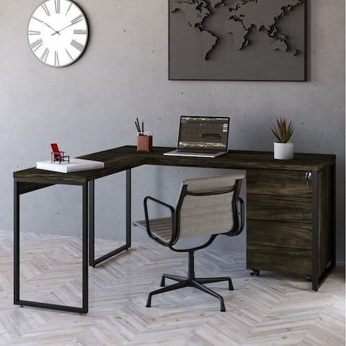 A linha Kuadra tem seu design com inspiração no estilo industrial, que remete muito a decoração utilizada nos lofts das grandes metrópoles nos anos 60 e 70. Harmonizando o metal e os tons de madeira, foram projetados móveis versáteis e com estilo, que podem compor ambientes flexíveis cheios de personalidade, perfeitos para você decorar sua casa ou seu trabalho, tendo um resultado que caminha do estilo rústico ao moderno. Suas estruturas são fabricadas em aço, com soldas suavizadas e pintura texturizada epóxi-pó. Conta com pés niveladores de altura, espessura dos pés de 30x20mm e parafusos na cor preta. para os tampos são utilizados MDP-BP acetinado com fitas de borda em PVC, dando uma maior durabilidade ao seu móvel. O conjunto KUML150 tem montagem simples e versátil, podendo ser utilizado Altura do Conjunto: 75 cm Ambiente: null Ambiente Principal: Escritório Cor: Carvalho Dark Informação Complementar: 1x Mesa de Escritório em L Estilo Industrial 1,50Mx1,50M Kuadra Carvalho Dark Largura: 150 cm Largura: 150 cm Altura: 75 cm Altura: 75 cm Peso: 24,6 kg Peso: 24,6 kg Profundidade: 60 cm Profundidade: 60 cm Necessita Montagem: Sim Necessita Montagem: Sim