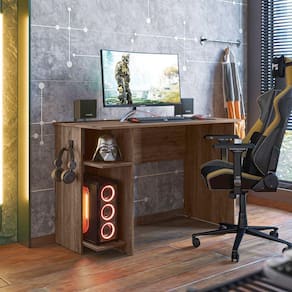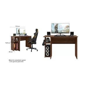 Características:Material: MDP- Pode Ser Montado Invertido: Sim- Quantidade de Pés/Sapatas: 6- Gancho para fones, bolsas- Espessura do Tampo (mm): 15- Marca: Qmovi- Cor: Nogal (Marrom).Pesos e Dimensões Altura (cm) 74.5 cm Largura (cm) 114 cm Profundidade (cm) 54 cm Peso (kg) 20.3 kgAtenção! Confira as dimensões deste produto e certifique-se de que passará normalmente por supostos elevadores, portas, escadas e/ou corredores de sua moradia; As imagens são ilustrativas, eletrodomésticos e demais objetos que compõem o cenário, não fazem parte do anúncio; (*Não acompanha cadeira gamer.) Sobre a tonalidade das cores, poderá ocorrer alterações conforme a configuração do seu monitor. Orientamos que a montagem e instalações do produto seja realizado por um técnico de sua confiança, após a sua entrega. Garantia de 3 meses pelo fornecedor.