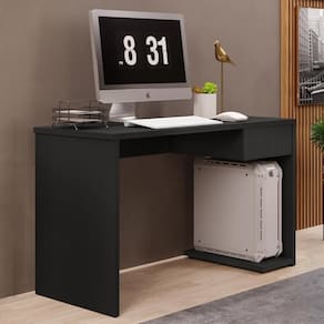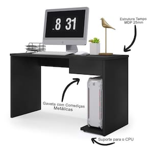 A Mesa De Escritório é feita toda em MDP que é um material resistente e durável, possui um tampo amplo oferece espaço suficiente para acomodar o seu monitor, teclado, mouse e outros acessórios. A Escrivaninha conta também com uma gaveta com corrediça metálica, que facilita a organização dos seus documentos e objetos pessoais. Além disso a Mesa Para já vem com base para CPU, na parte interna do lado direito da mesa. Ela tem um design moderno e funcional e combina com qualquer ambiente de trabalho ou estudo.