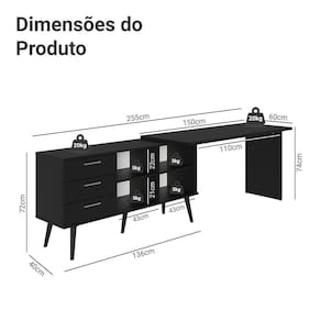 - Reta: 74 cm de altura x 255 cm de largura x 60 cm de profundidade total