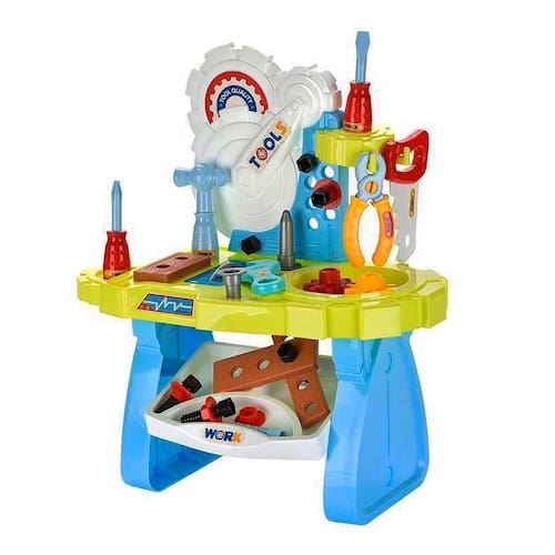 A bancada de trabalho é feita de plástico resistente e inclui uma variedade de ferramentas de brinquedo, como martelo, chave de fenda, alicate, serra, entre outros. Ela também possui gavetas e prateleiras para guardar as ferramentas e outros acessórios.