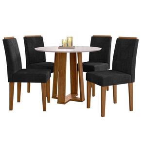 Está montando sua sala de estar? Então apresentamos para você este belo conjunto composto pela mesa de jantar da linha Isabela com quatro cadeiras da linha Amanda. A mesa possui o formato redondo, com 100cm é perfeita para acomodar quatro pessoas. O tampo com vidro aplicado 3mm, oferece durabilidade e um toque moderno. As cadeiras com assentos e encostos estofados com espuma D18, proporcionando conforto e resistência. O revestimento é feito em tecido de veludo, macio ao toque, e possuindo acabamento bordado. Fabricados pela New Ceval, são desenvolvidos em MDF de alta qualidade. Será a escolha ideal para quem busca aliar praticidade, conforto e estilo. Confira e garanta o seu!
