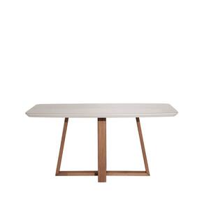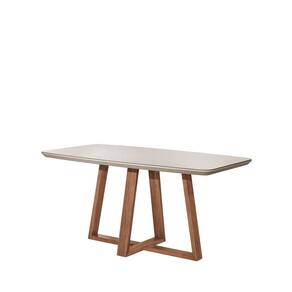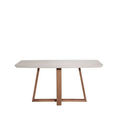 Com pés em madeira maciça e acabamento em Verniz PU, sua base em formato cruzado otimiza o espaço e facilita o encaixe de diferentes modelos de cadeiras. O tampo em MDF de 40 mm, com formato barril, recebe acabamento em pintura PU e aplicação de vidro pintado de 3 mm, unindo sofisticação e praticidade.