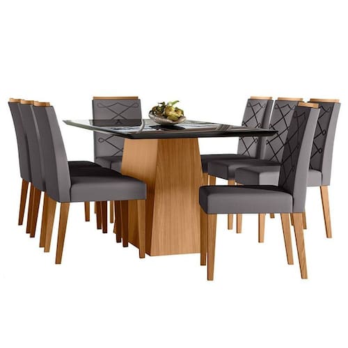 Mesa de Jantar 180cm Bárbara com Vidro Ype Preto e 8 Cadeiras Caroline Ype Veludo Cinza – New Ceval