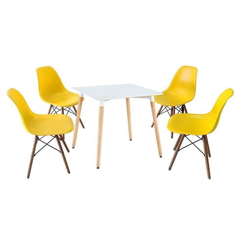 O conjunto de mesa de mesa de jantar quadrada branca 80 cm + 4 cadeiras Eames amarelas é um item importante para decoração do seu lar. Independente do uso, esse conjunto harmoniza bem com cozinhas e salas de jantar. brbrProduzida em MDF, uma placa de fibra de média densidade, a mesa quadrada possui pés em madeira e acabamento em pintura. brbrAlém disso, essa strongmesa quadrada/strong de 80 cm é mais fácil de limpar, pois basta só passar um pano umedecido. brbrJá as strongCadeiras Eames/strong são produzidas em polipropileno e madeira, por isso, são mais leves, resistentes e seguras. Além disso, esse material também facilita a limpeza, podendo ser usado tanto em ambientes internos como externos. brbrSeja qual for o ambiente ou ocasião tenha em casa o Conjunto mesa de jantar quadrada branca + 4 cadeiras Eames amarelas.brbrClique em comprar e ganhe 3 meses de garantia pelo fabricante.brbr bMesa quadrada branca com pés de madeira/bbrCor: BrancobrMaterial: MDF e madeirabrTampo em MDF no formato quadradobrPés de madeirabrProduto enviado desmontado, montagem não inclusabrGarantia: 3 mesesbrAltura: 75 cmbrLargura: 80 cmbrComprimento: 80 cmbrPeso: 12,70 kgbrbrbCaracterísticas da Cadeira nude com pés de madeira/bbrCor: nudebrAssento e encosto em polipropilenobrPés em madeira com estrutura de metalbrAltura: 81 cmbrLargura: 46 cmbrProfundidade: 53 cmbrPeso: 4 kg cadabrbrbConteúdo do kit:/bbr1 Mesa de Jantar quadrada 80cm Travel Max -Brancabr4 Cadeiras Eames Eiffel - Nude