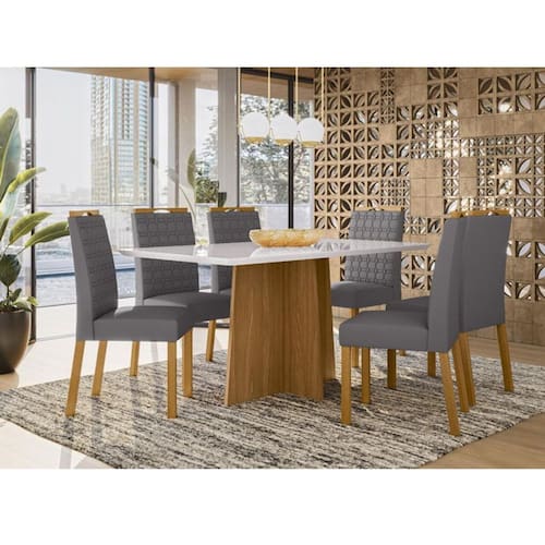 Esta montando sua sala de jantar ou cozinha? Nós temos a opção certa para que seu ambiente fique ainda mais bonito com toque refinado e mais funcional para o dia a dia.Apresentamos a mesa da linha Anitta e as cadeiras da linha Mariana. Um design moderno e sofisticado. Ideal para espaços maiores, acomoda confortavelmente até 6 pessoas. A mesa é desenvolvida em MDF, seu tampo possui aplicação de vidro adicionando elegância. As cadeiras são resistentes produzidas em madeira e macias, possuem espuma D 18 e revestimento com tecido de excelente qualidade com detalhes bordados. Não perca mais tempo a hora é agora deixe seu ambiente acolher e inovado venha adquirir já o seu!