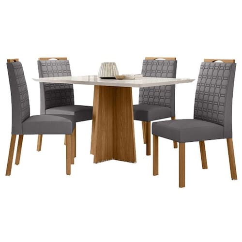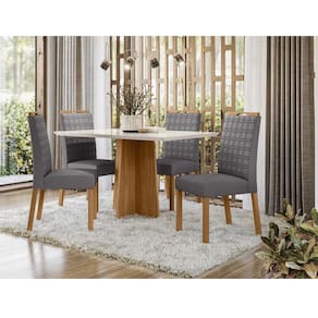 Está montando sua cozinha ou sala de jantar? Então apresentamos para você este belo conjunto fabricado pela New Ceval, composto pela Mesa de Jantar da linha Anitta com as Cadeiras da linha Mariana, com um design contemporâneo.Possui tampo com aplicação em vidro dando um toque sofisticado. As cadeiras são o complemento perfeito, projetadas para combinar perfeitamente com a mesa, desenvolvidas em madeira, tecido de veludo, detalhes bordados e espuma D 18 no assento e no encosto proporcionando conforto durante as refeições. Deixe sem ambiente mais bonito agradável, e funcional venha fazer a escolha ideal, adquira já a sua!