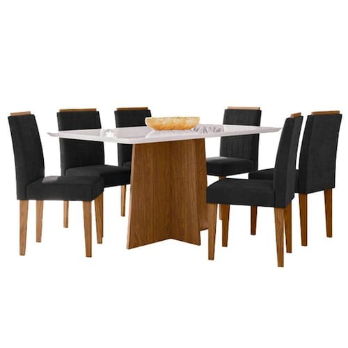 Esta montando sua sala de jantar ou cozinha? Apresentamos esse lindo conjunto fabricado pela New Ceval, a mesa da linha Anitta e as cadeiras da linha Ana.Com um design moderno e elegante. Ideal para espaços maiores, acomoda confortavelmente até 6 pessoas. A mesa e as cadeiras desenvolvidas em MDF. O detalhe destaque da mesa e que seu tampo possui aplicação de vidro dando um toque refinado. As cadeiras possuem espuma D 18 e revestimento com tecido de excelente qualidade com detalhes bordados. Torne os momentos das refeições mais agradaveis e aconchegante venha garantir já o seu!