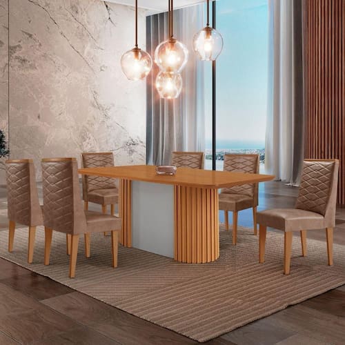 O conjunto combina design moderno, sofisticacao e funcionalidade. A Mesa Aspen se destaca pelo visual imponente, com tampo em MDF e canto copo, alem da base ripada que confere textura e personalidade ao ambiente. Ideal para quem busca um estilo clean e contemporaneo, ela transforma qualquer espaco com leveza e elegancia.