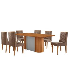 O conjunto combina design moderno, sofisticacao e funcionalidade. A Mesa Aspen se destaca pelo visual imponente, com tampo em MDF e canto copo, alem da base ripada que confere textura e personalidade ao ambiente. Ideal para quem busca um estilo clean e contemporaneo, ela transforma qualquer espaco com leveza e elegancia.