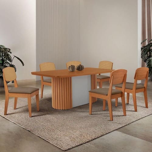 Mesa De Jantar Aspen 180cm Tampo Mdf Laminado Copper Premium Veludo Capuccino//off White Conjunto Mesa Aspen e Cadeira Copper Premium A Mesa Aspen traz um design moderno e imponente, com tampo em MDF e canto copo. Sua base ripada em MDF e o grande destaque da peca, trazendo uma textura cheia de personalidade. A Mesa Aspen transforma qualquer ambiente com sua presenca unica e atual o modelo perfeito para quem busca um design clean e sofisticado, trazendo leveza ao seu ambiente.