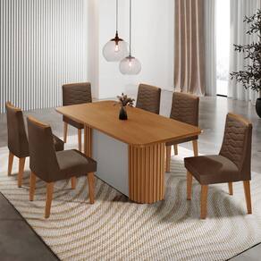 Mesa De Jantar Aspen Com 6 Cadeiras Eloise Moderna Mobília Veludo Marrom/naturalle Apresentamos a nossa Mesa Aspen e as sofisticadas Cadeiras Eloise, um elegante conjunto de sala de jantar que traz sofisticacao e modernidade ao seu ambiente. A mesa se destaca com sua base com detalhes ripados, que adiciona um toque unico, enquanto as cadeiras, totalmente estofadas e com bordados, oferecem conforto e estilo. As alcas proporcionam um visual moderno e diferenciado. Inspirado nas montanhas de Aspen, este conjunto e ideal para criar um ambiente acolhedor e convidativo em sua casa. Nao perca a chance de transformar sua sala de jantar!